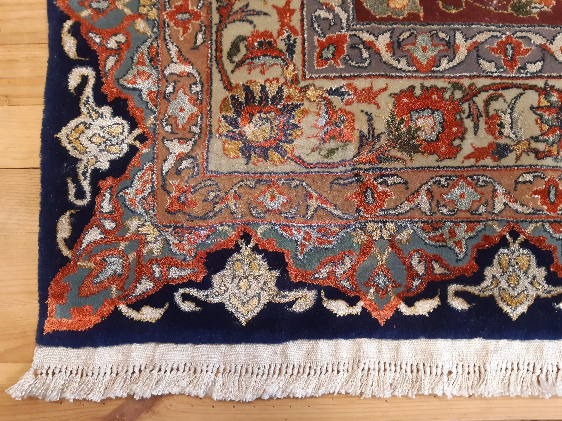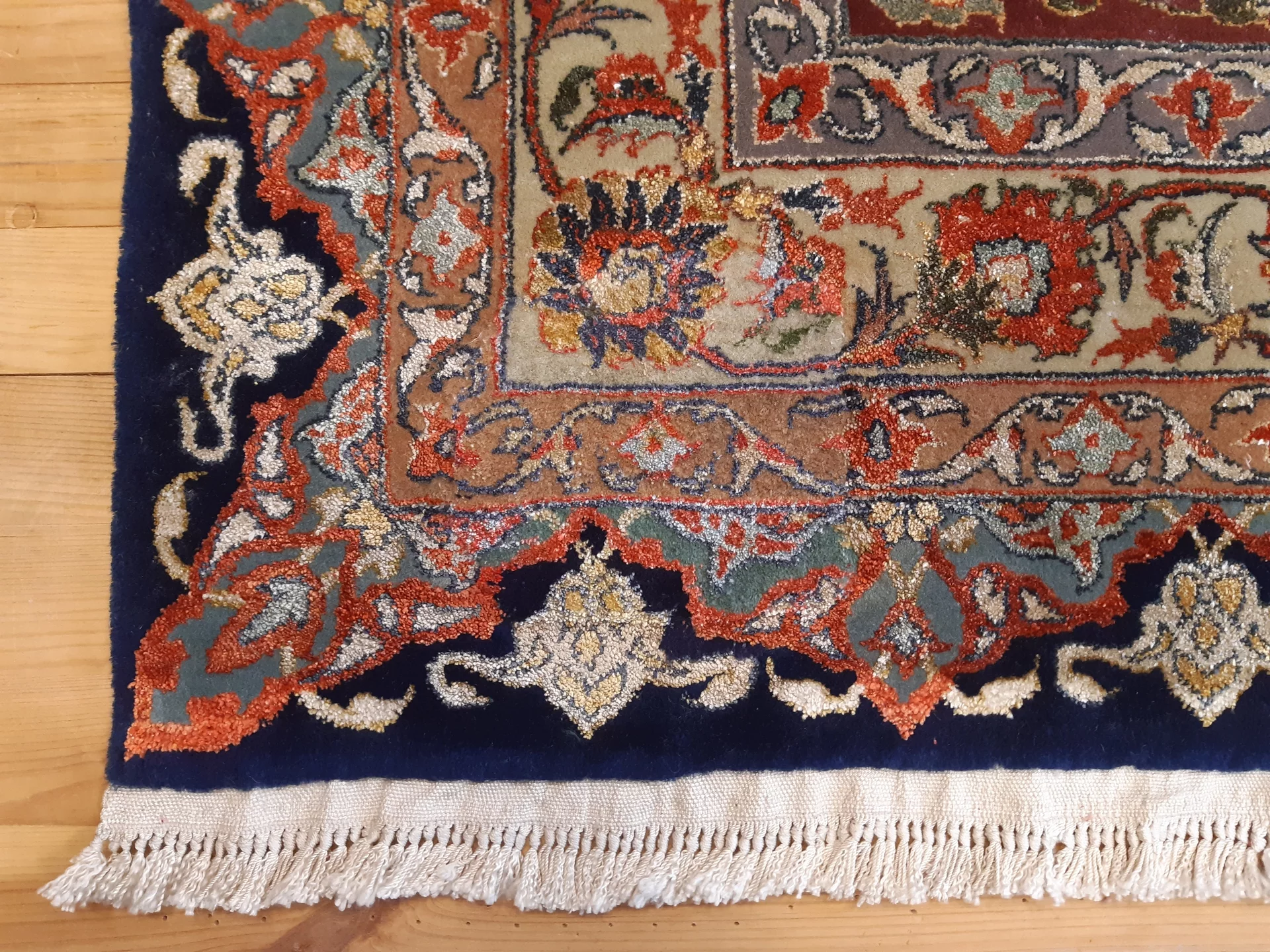 Verwendung von hochwertigen Materialien, darunter seltenes nomadisches Schurwollgarn, feinste Knüpfwolle und hochwertige Seide für langlebige Ergebnisse