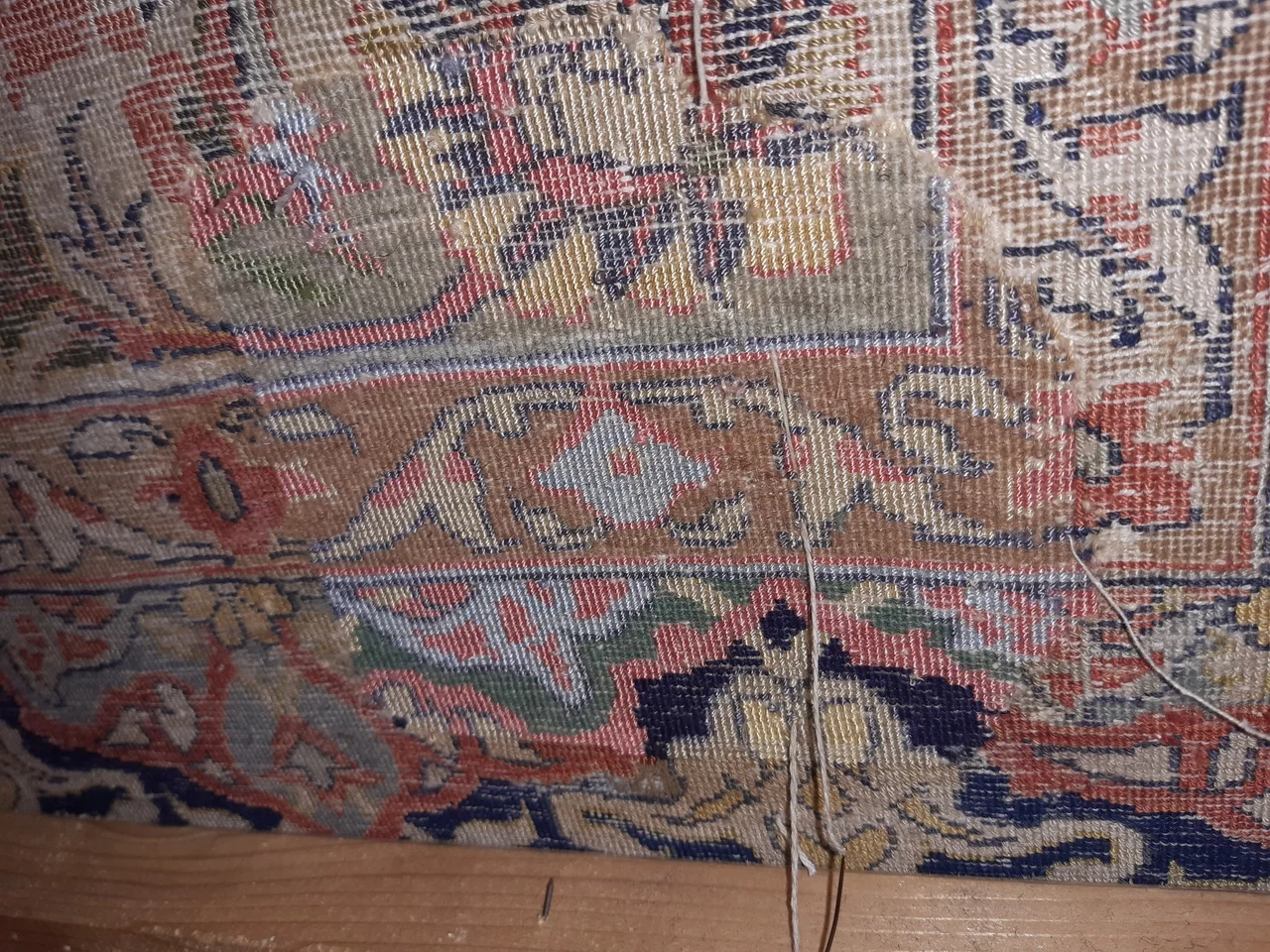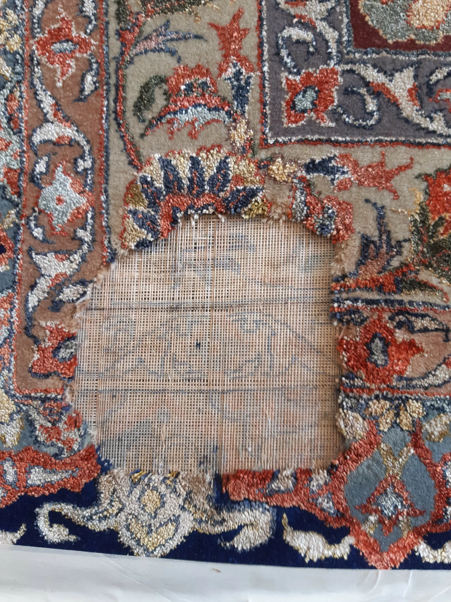 Restaurierungsprozess Antiker Teppich - Wolle und Seide Geknüpft auf Baumwolle - Beschädigung durch einen Blumentopf