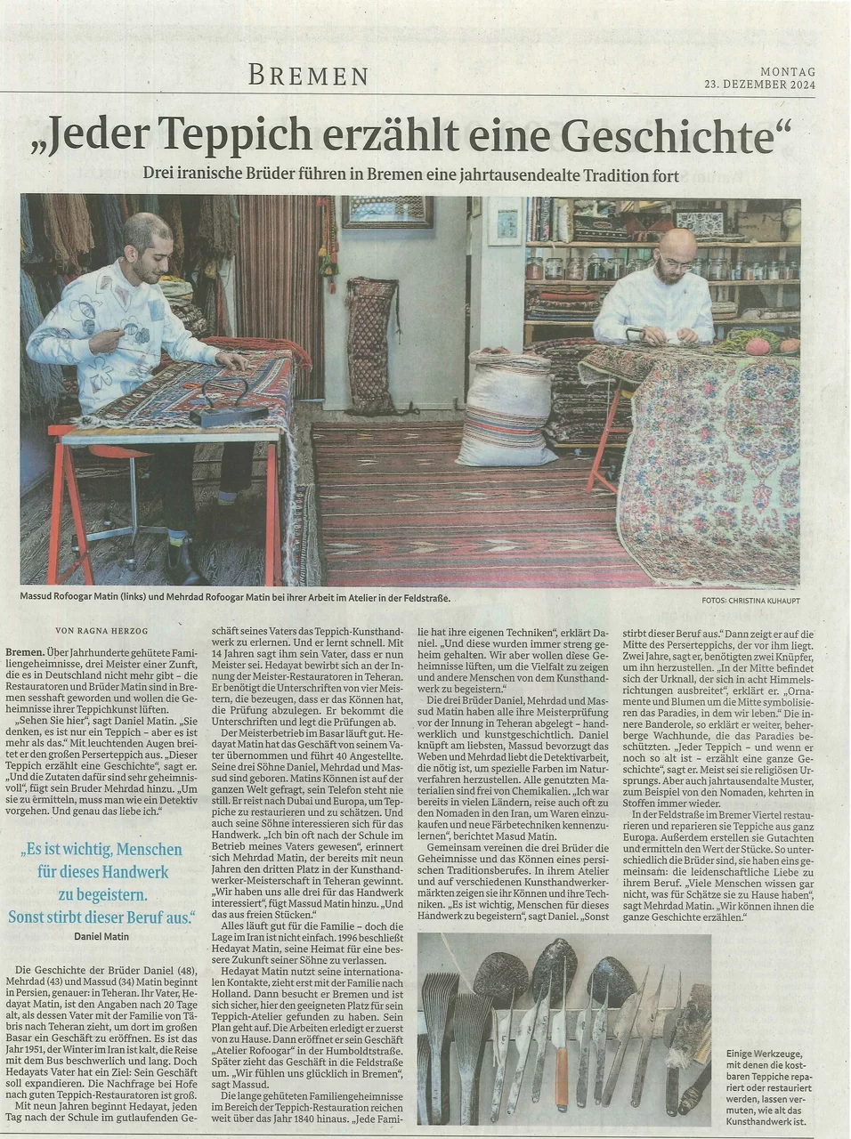 Seit über 20 Jahren führt die Familie Rofoogar Matin ein Atelier in der Hansestadt Bremen. Unsere Expertise umfasst die fachgerechte Restaurierung, Reparatur und Konservierung antiker Teppiche und kunsthistorisch wertvoller Textilien – sowohl in Bremen, Hamburg, Niedersachsen als auch bundesweit.